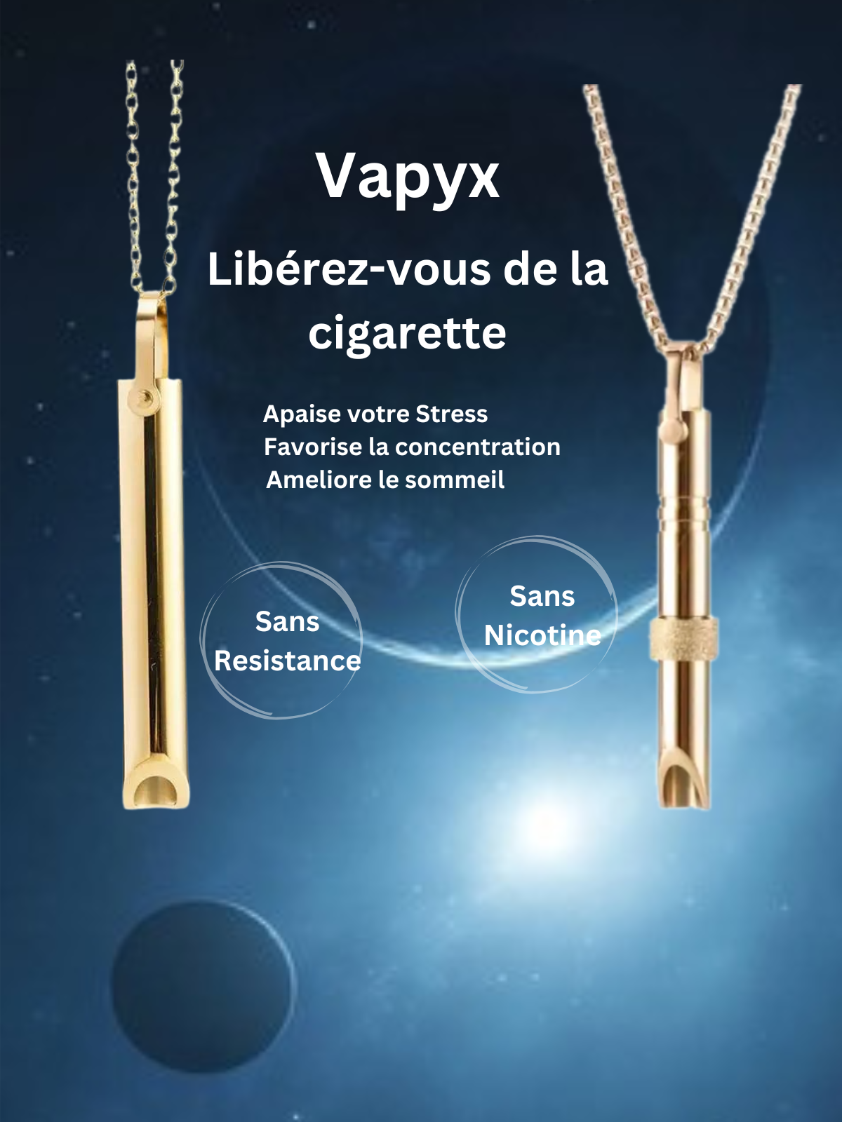 Vous souhaitez arrêter de fumer sans perdre la sensation familière de l'inhalation ? Découvrez Vapyx, un dispositif innovant qui recrée la résistance d'une cigarette, grâce à son entrée d'air unique. Contrairement à une cigarette traditionnelle, Vapyx ne contient ni nicotine ni produits chimiques, pour une expérience saine et naturelle.
